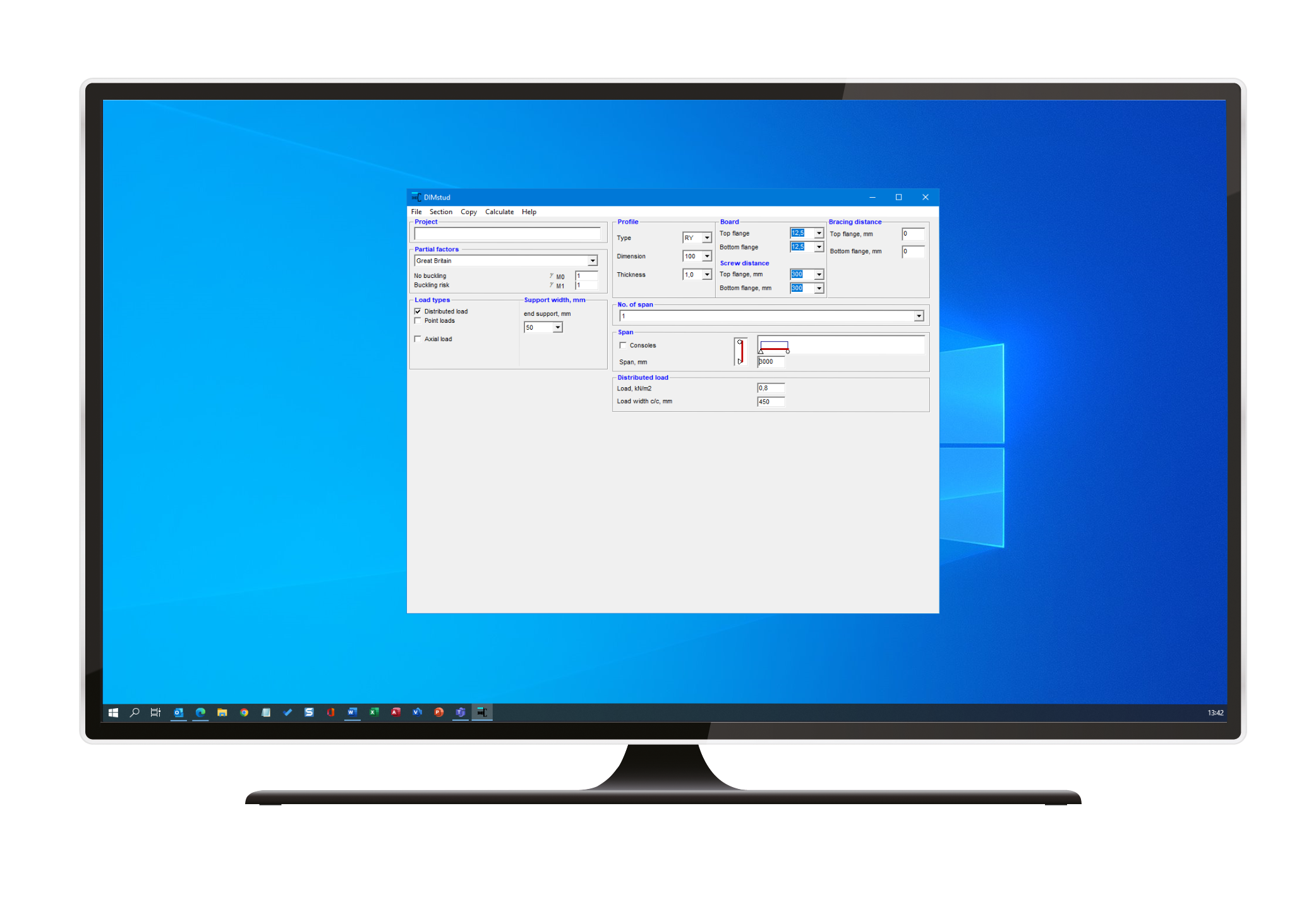 DIMstud is a Eurocode based design software for slotted studs and runners. The software can calculate exterior wall studs RY, RYF and HRY as well as exterior wall runners SKY and HSKY. The software presents results in Ultimate Limit State and Serviceability Limit State.