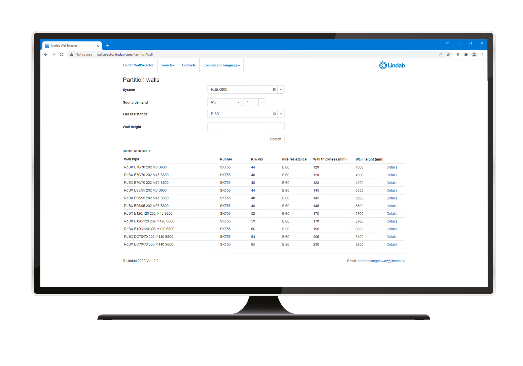 Application that can be used when you are looking for a wall with certain requirements in terms of sound, fire, wall height, etc. Specify relevant criteria for your wall and available wall configurations that meet the requirements will be presented in a table.