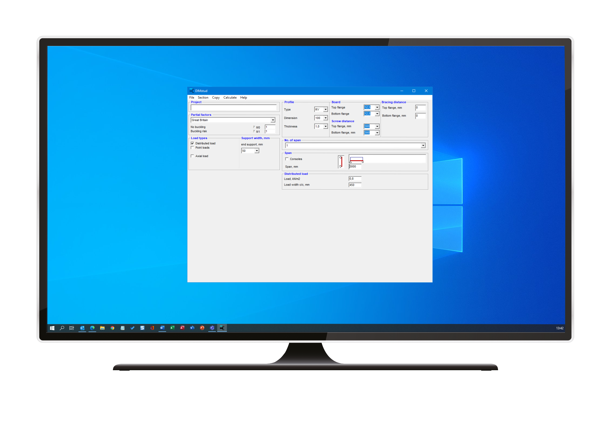 DIMstud is a Eurocode based design software for slotted studs and runners. The software can calculate exterior wall studs RY, RYF and HRY as well as exterior wall runners SKY and HSKY. The software presents results in Ultimate Limit State and Serviceability Limit State.