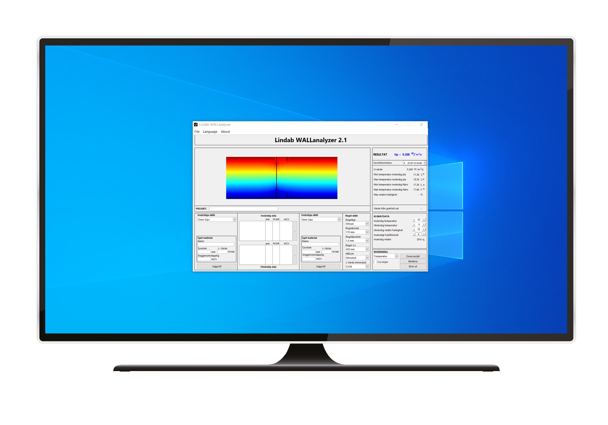 Calculates the U-value for exterior walls consisting of Lindab's slotted exterior wall profiles combined with optional materials on both sides. The program can also analyze the moisture content of the structure under given conditions.