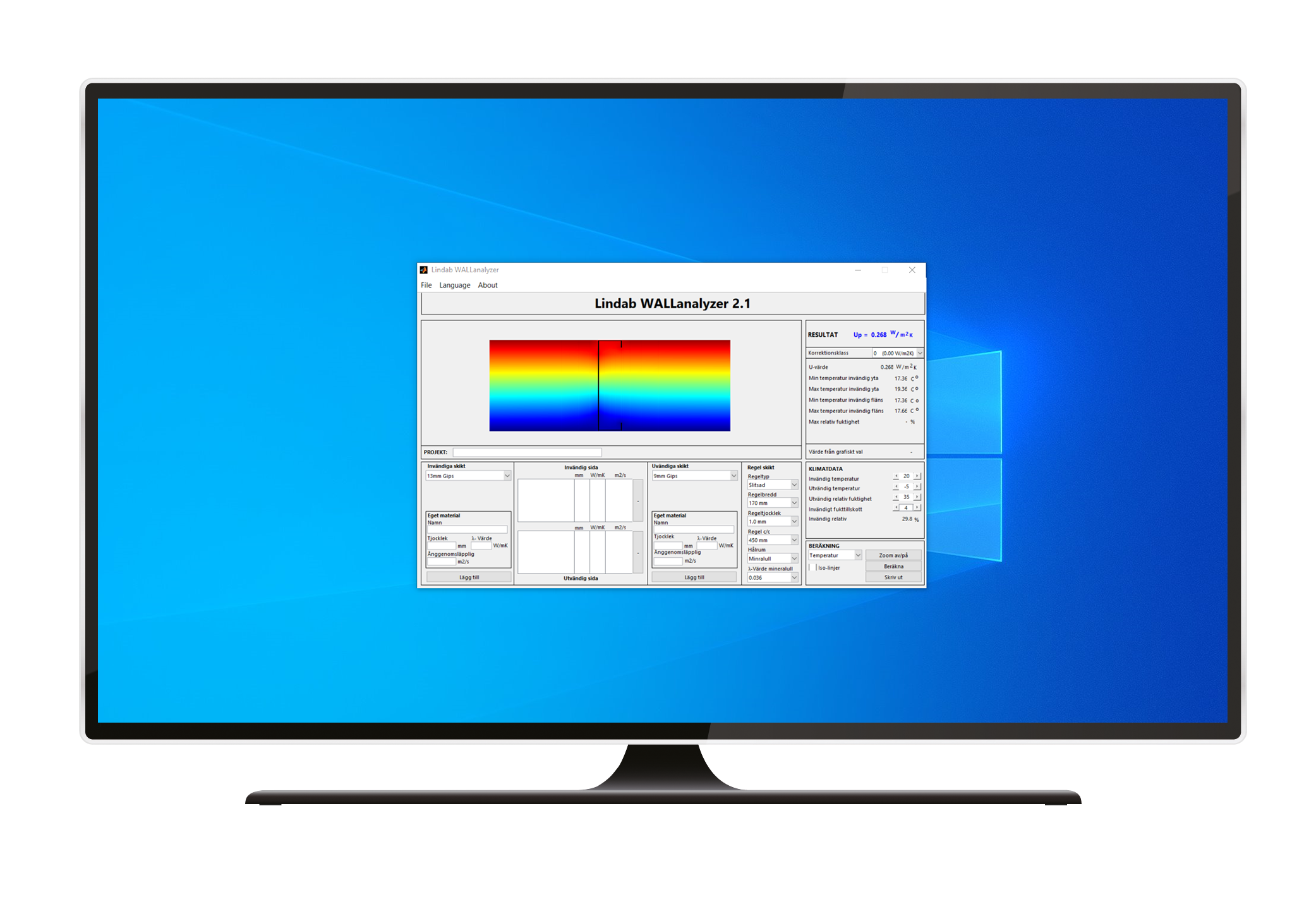 Calculates the U-value for exterior walls consisting of Lindab's slotted exterior wall profiles combined with optional materials on both sides. The program can also analyze the moisture content of the structure under given conditions.