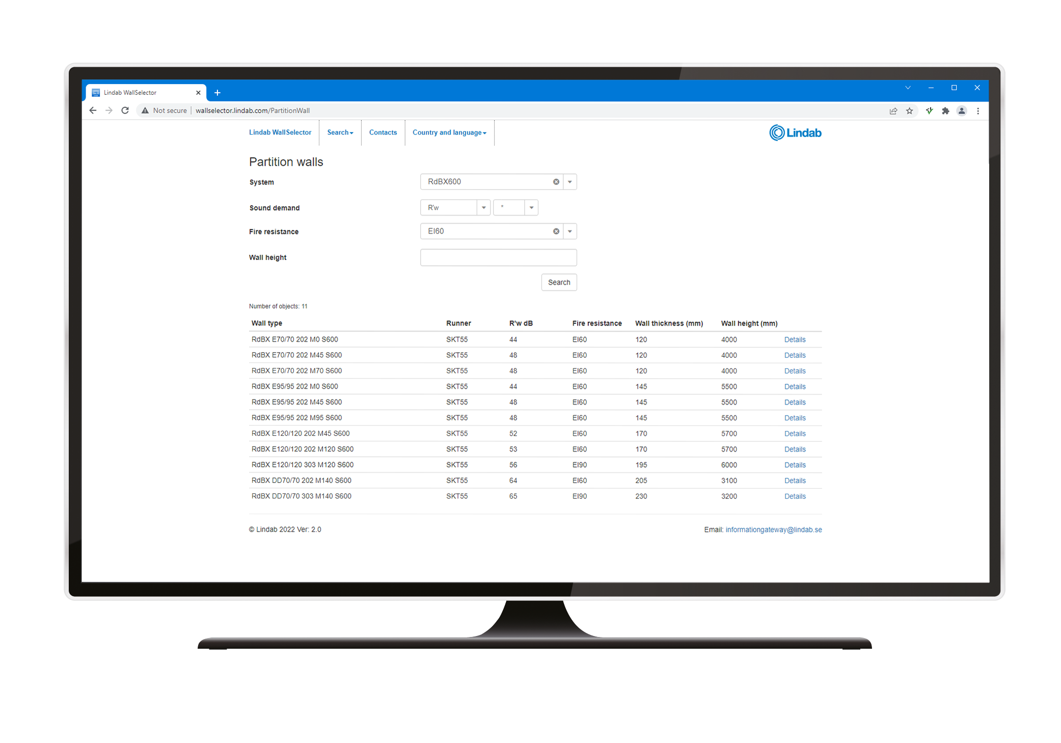 Application that can be used when you are looking for a wall with certain requirements in terms of sound, fire, wall height, etc. Specify relevant criteria for your wall and available wall configurations that meet the requirements will be presented in a table.