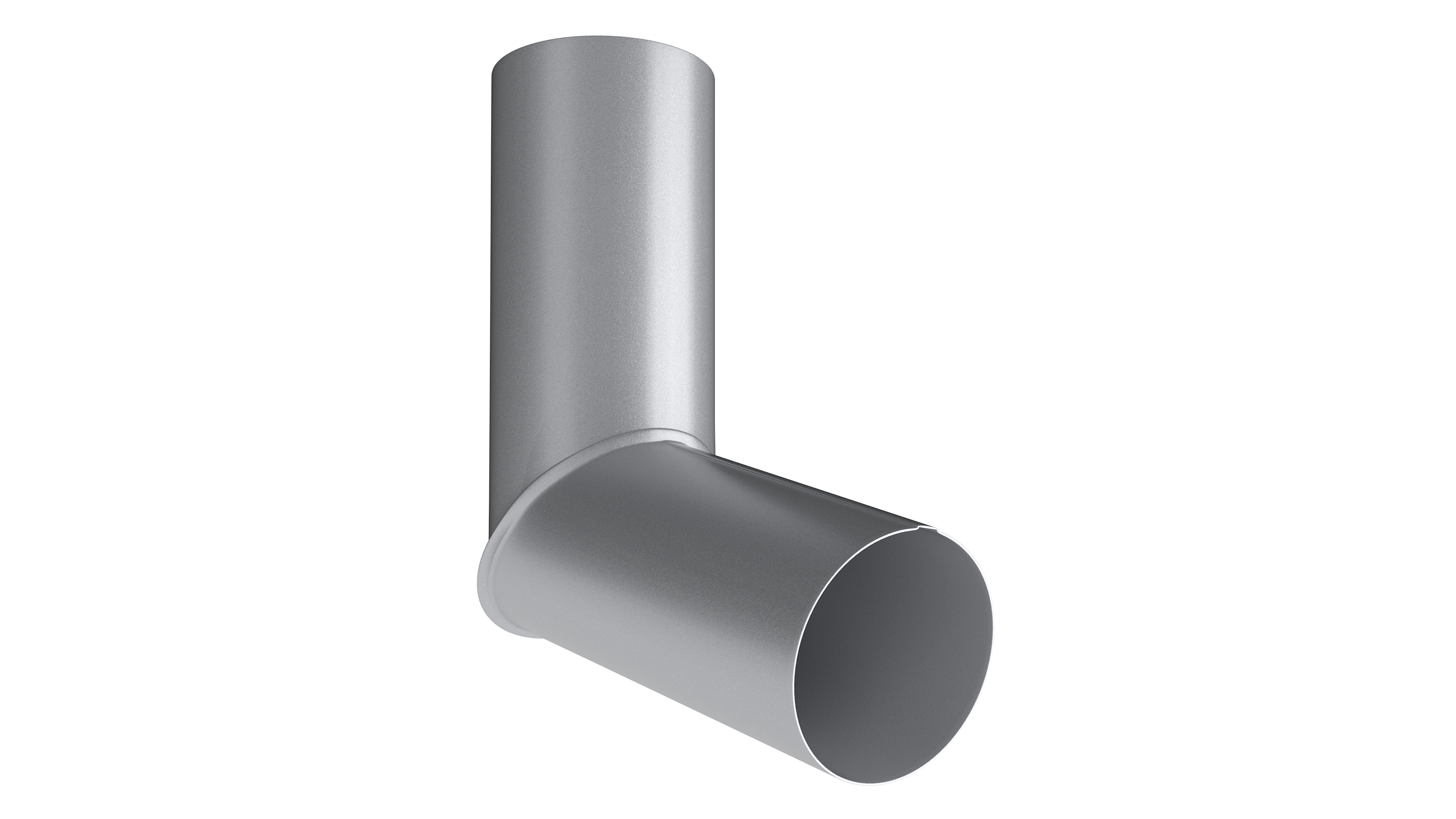 Sharp pipe bend at 70 degrees, developed to fit perfectly with the gutter outlet. There is no need for fasteners or rivets to ensure that the bend does not fall down. The end with the label is always the small end that fits into the next product in the system. All products in the downpipe range have this logic to make installation easier and faster. The label is concealed after installation.
