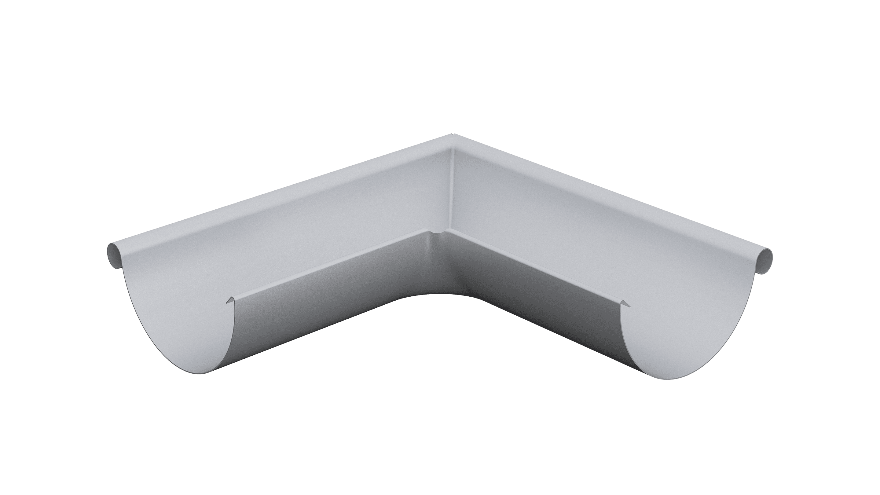 Gutter angle for half-round gutter at 90 or 135degrees. It is pressed in one piece, not welded which eliminates the risk for leakage. This product is made of pre-coated galvanised steel with 0.6 mm thickness.