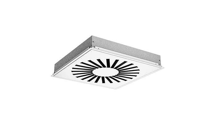RS15 is a square swirl diffuser with adjustable bars that can be used for both supply and extract air. The swirl pattern ensures high induction and a large dynamic range. It is therefore ideal for the horizontal supply of very cold air. The diffuser can also be set to a vertical supply air pattern, enabling supply of heated air. The diffuser is supplied as standard with inward swirl. For extract, the diffuser is supplied as standard without bars.
