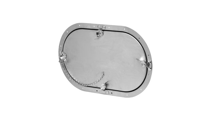 Consists of a door and a frame. The door has a 20 mm thick high density insulation. The frame is attached to the duct wall by means of screws. A gasket as well as a retaining chain is fitted between door and frame.