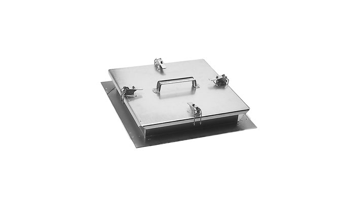 The access door is also used as an inspection hatch for rectangular ducts. To the access door belongs a fixing frame, which is attached to the rectangular duct. This is normally done with blind rivets through the folded-down edge of the done frame. It can also be provided with folding tabs on request.