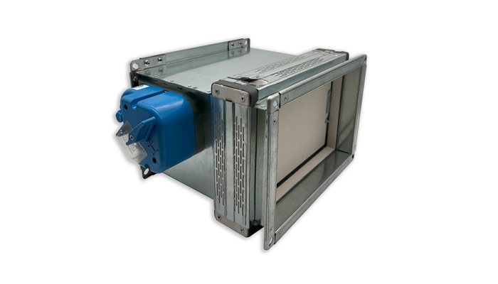 Rectangular fire damper for air duct system that penetrate fire resistance walls or floors. With 25 mm thick closing blade made from refractory material. Casing leakage performance class C according to Standard EN1751:2014 section C.3.