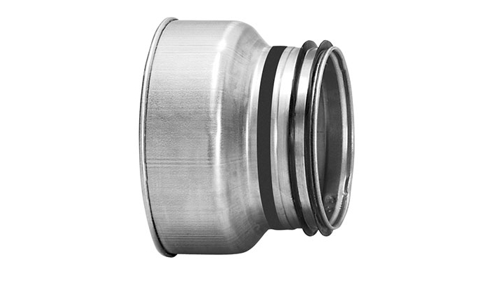 Pressed, concentric reducer with female coupling to meet demands for short installation length with low pressure drop and low internal noise generation. Ød fits outside another fitting.