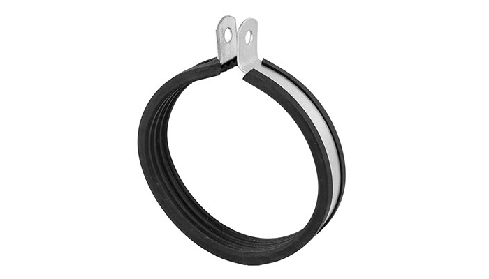 Clamp with short ear, with vibration-damping internal rubber lining, for suspension of circular ducting in restricted spaces.