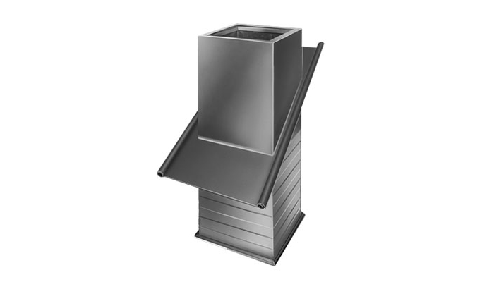 Rectangular roof transition, consisting of galvanized duct with 50 mm internal insulation, upon which the flexible roof tile is mounted. Delivered with grey flexible roof tile as standard.