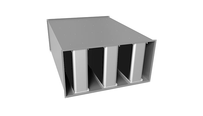 MINKA is a rectangular duct attenuator in galvanized steel* with baffles (splitters) filled with felt coated mineral wool attenuation material.