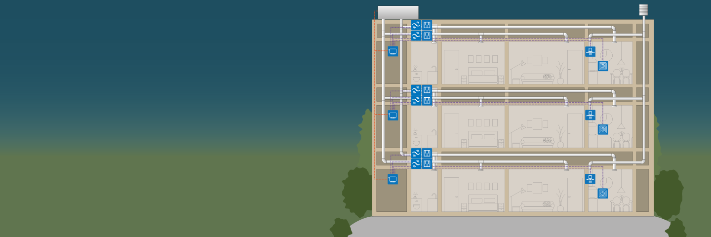 Connection box with power supply, simple wiring, and easy commissioning make sure that the system is up and running in the background. You just select the suitable ventilation mode from the switch on the wall. Away when you go outside for longer periods of time, Home for normal use and Forced ventilation when you have a party or other situation that requires more ventilation.